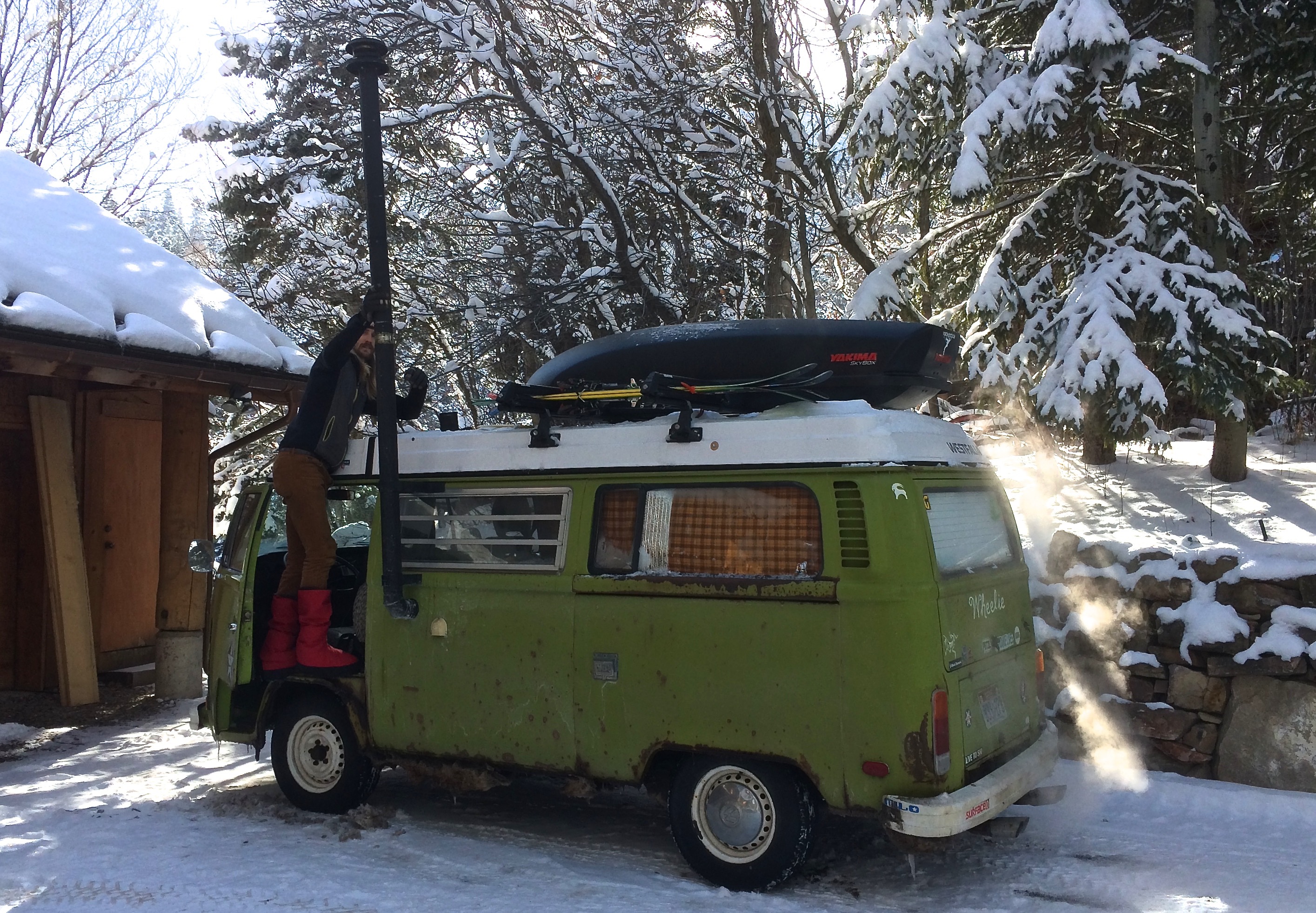 Another issue we had to deal with was installing a chimney. Because our bus has a Westfalia pop-top we couldn’t extend the chimney out the roof of the bus– instead the pipe protrudes out the side at a 90 degree angle. She now looks like a baddass-mobile, or a hillbilly contraption, depending on who you ask. What we didn’t realize at first was that the elbow in the chimney, and the fact that the vertical section after it was only five feet long were going to create problems with the stove. For the first few weeks after we moved into the bus we couldn’t get the stove to heat the tiny space and we got smoked out on numerous occasions. We were to the point of wanting to return the stove and try to figure out something else.