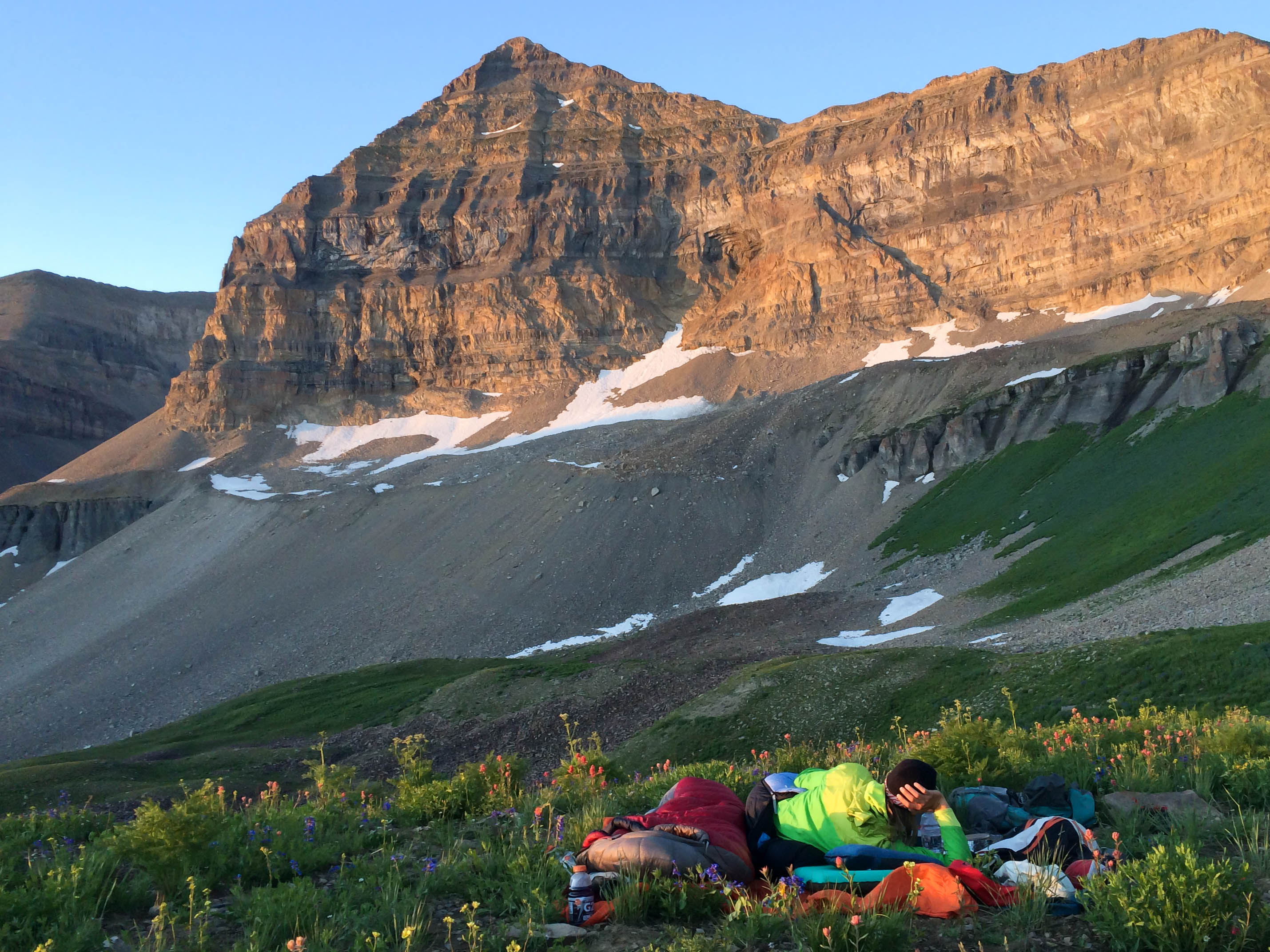 • Monday morning Matt and I woke just as the sky started glowing red from sunrise. We don’t often get up that early, so it was a treat to watch the magnificent display unfold as we were curled up in our sleeping bags. Timpanogos is a beautiful mountain, but it is especially grand when the light first hits it’s peaks. After everyone had awoken, we hid our camping gear and made the mile and  a half jaunt to the summit, waving to our friends and families in the valley below. We took our time on the way back to the car, soaking in the smell of the wildflowers as we went. Every sense seems to be heightened in the mountains– the world feels so much clearer. Back to the bus to run a few errands before nightfall.